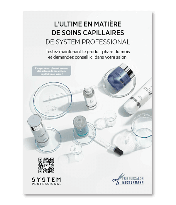 Vous souhaitez présenter l’offre System Professional du mois et proposer des conseils compétents sur ce soin ? Utilisez notre plaquette avec QR code pour orienter votre clientèle vers la vidéo explicative correspondante. Le QR code est automatiquement mis à jour chaque mois. Inutile donc de changer la plaquette !